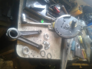 Tak więc rozebrałem go na czynniki pierwsze i poddałem weryfikacji organoleptycznej, czyli oglądnięciu. Rozłożyłem też wał wykorbiony, który okazał się nieprawidłowo naprawiony, więc postanowiłem go naprawić poprawnie. Postanowiłem najpierw napawać czop rozrządu i naciąć na nim gwint co sie nawet udało, ale okazało sie, że czop ów sie skrzywił. Postanowiłem go naprostować ale wziął i pękł, więc chcąc-niechcąc musiałem zrobić go od nowa. Czop napędowy również nie był za ciekawy, więc też postanowiłem go wykonać jak również, co oczywiste, czop korbowy. Czopy wykonałem ze stali do nawęglania powierzchniowego i hartowania a czop napędowy ze stali do ulepszania. Poza tym zaspawałem nawiercenia w żeliwnych tarczach wału w otworach na czop korbowy po uprzednim podgrzaniu wstępnym tarcz do czerwoności. Zrobiłem to po to, żeby spoina nie utwardziła sie.